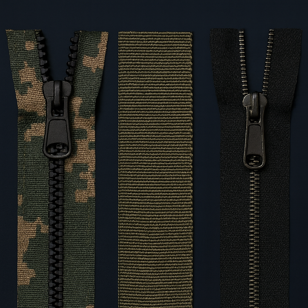 Heavy-duty zippers for gear panels, holster mounts, and modular attachments. Molded tooth #10/#12/#15/#20 handle frequent reconfiguration, while double-pull and long-pull sliders provide quick access from either side.