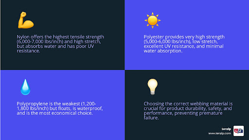 Nylon webbing tops the chart with up to 7,000 lbs per inch of tensile strength, making it ideal for high-stress and safety-critical applications.